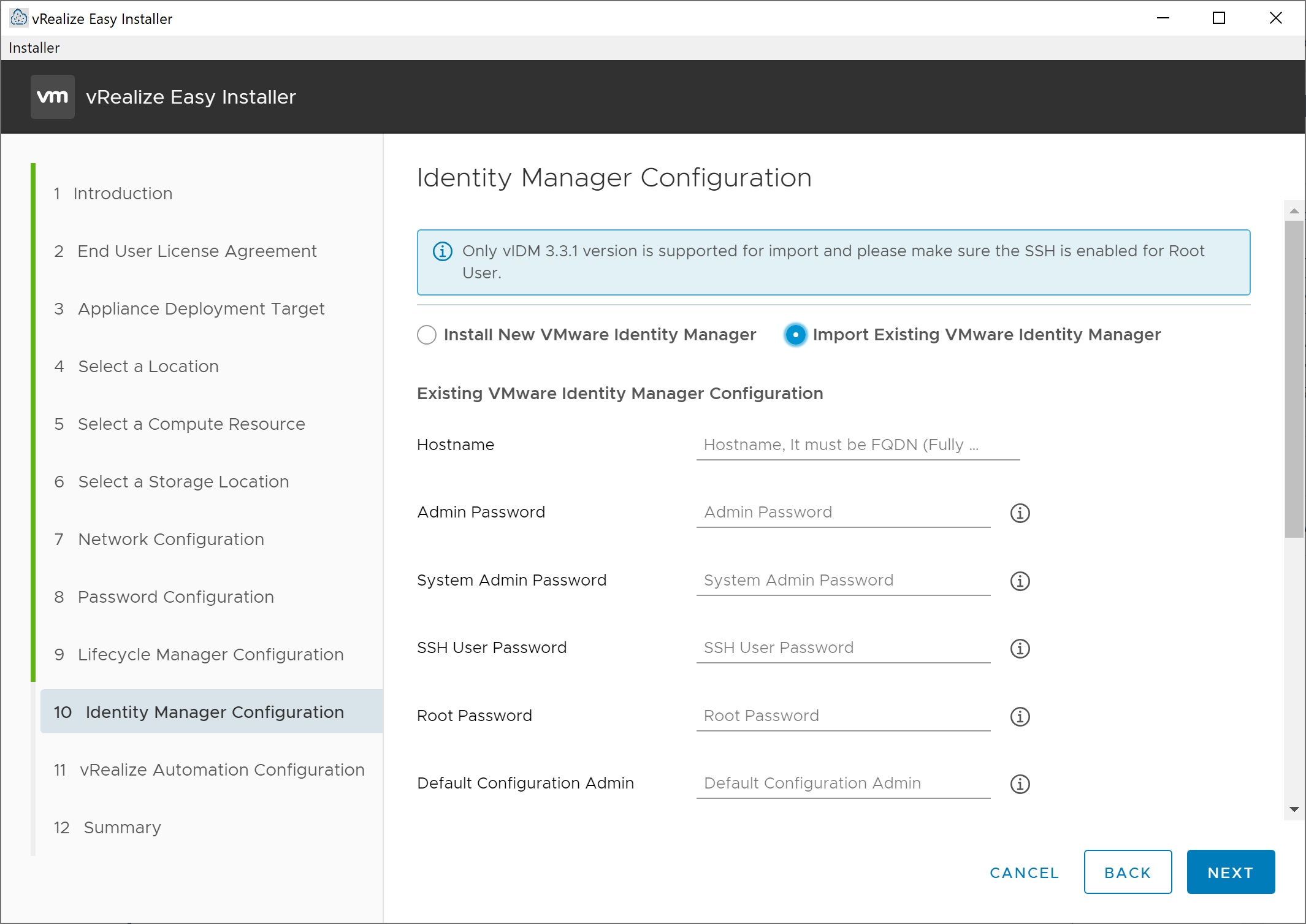 On the resulting Password Configuration screen, enter the password that will be utilized for the root and admin account on the vRealize Suite Lifecycle Manager and Identity Manager appliances, then click Next.