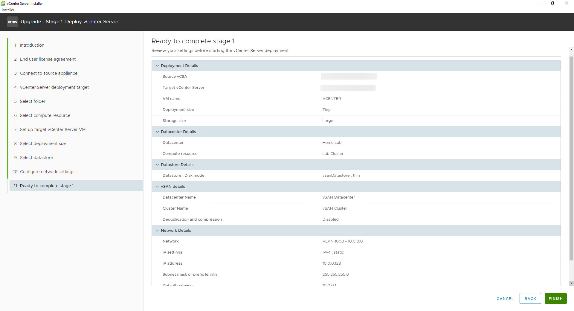 Finally, review the details you provided before executing Stage 2 of the process. If the data is correct, confirm that you have a backup of the source vCenter Server appliance and click FINISH to complete the remainder of the upgrade process.